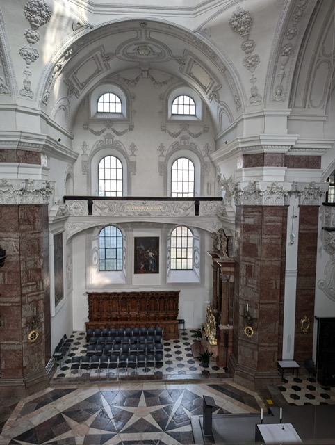 Unsere Führung beinhaltete die Jesuitenkirche, einem architektonischen Meisterwerk, das nicht nur durch seine kunstvolle Gestaltung beeindruckt, sondern auch durch seine spirituelle Atmosphäre. Dr. Marte erläuterte die Bedeutung der einzelnen Altäre, Gemälde und Kunstwerke und brachte uns dabei die Symbolik und religiöse Bedeutung dieser Kostbarkeiten näher. Wir erfuhren auch, wie der Orden heute versucht, Spiritualität und Zeitgeschehen zu verbinden und sich aktuellen Herausforderungen, etwa in der Bildungsarbeit oder im sozialen Engagement, zu stellen.