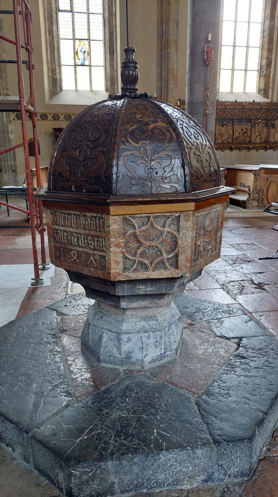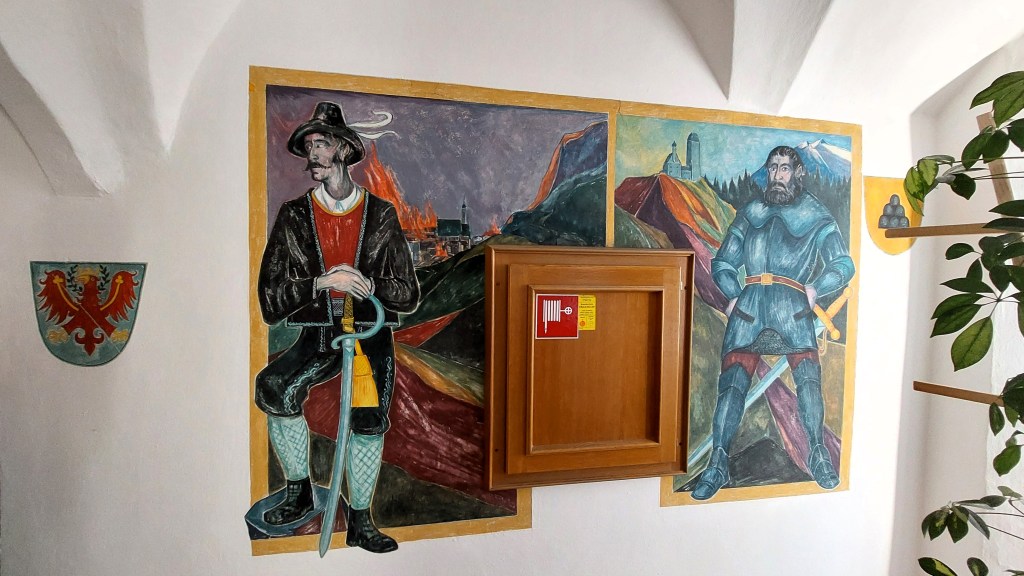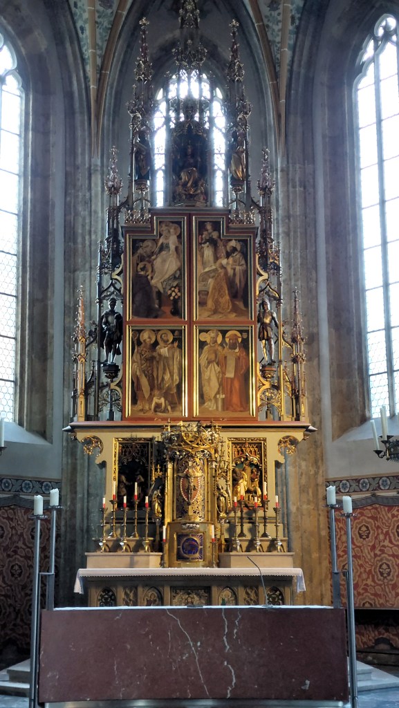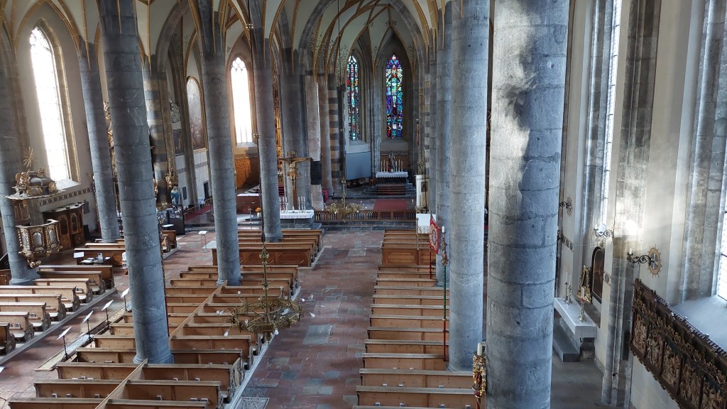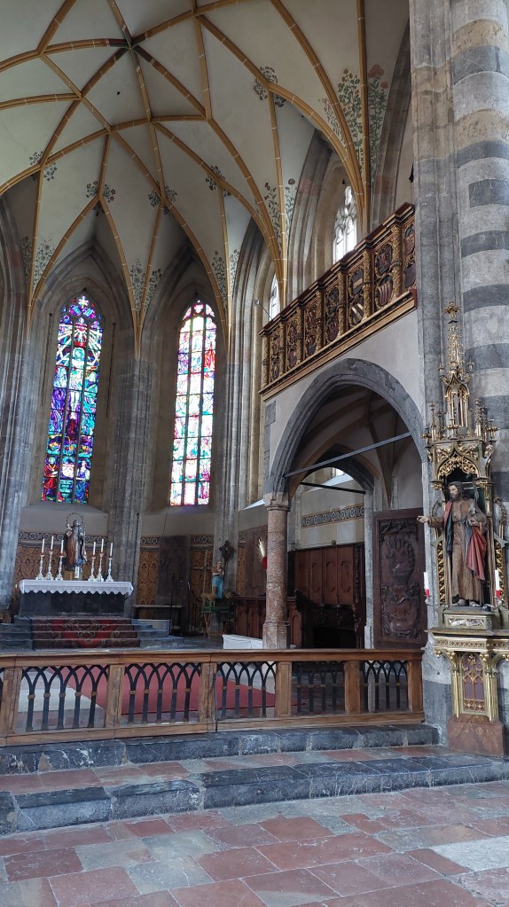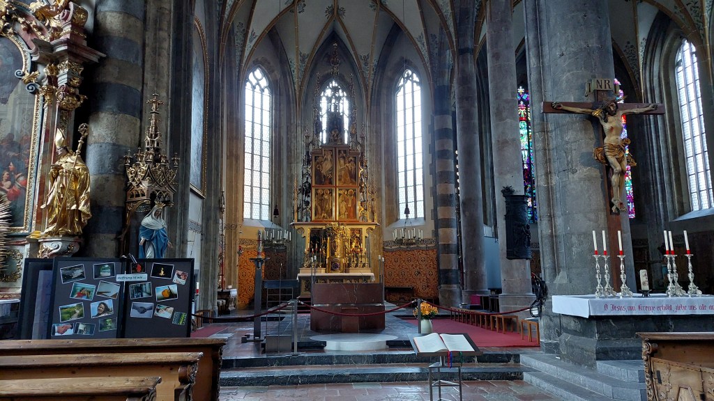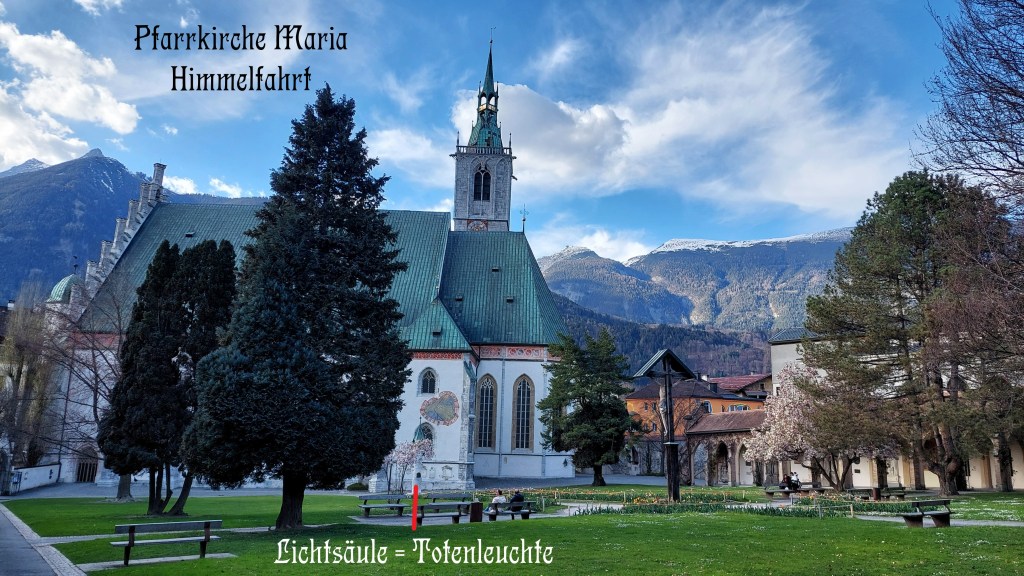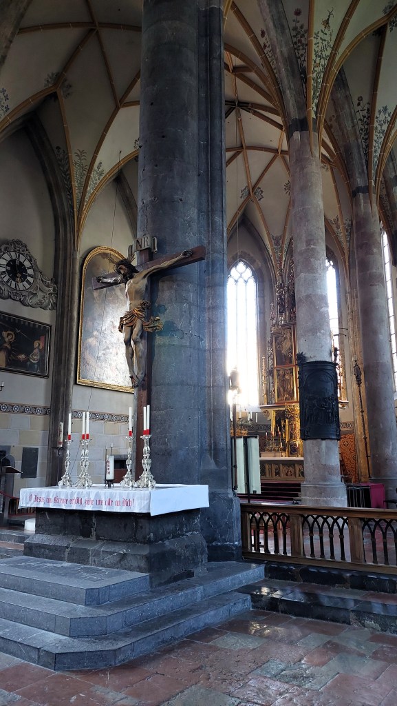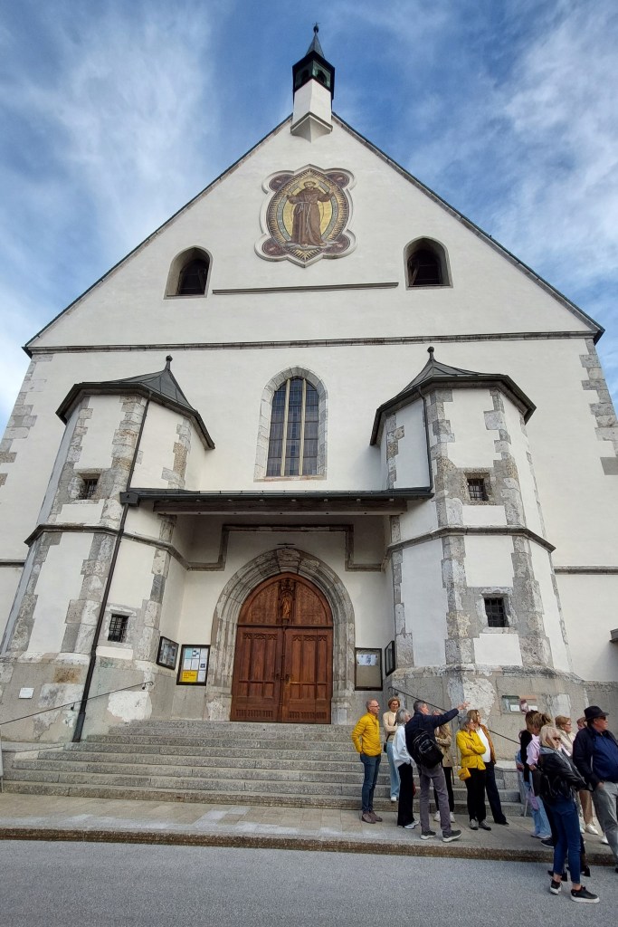 Der Treffpunkt war um 15 Uhr vor dem Rathaus. Nach einer kurzen historischen Einführung führte uns Herr Winkler zu einigen der geschichtsträchtigsten Orte der Stadt: zum Mathoihaus, in den Kreuzgang des Franziskanerklosters, in den Garten des Fuggerhauses (heute im Besitz der Tertiarschwestern) und schließlich in die beeindruckende Pfarrkirche Schwaz, wo sich das Grabmal der Fugger befindet.